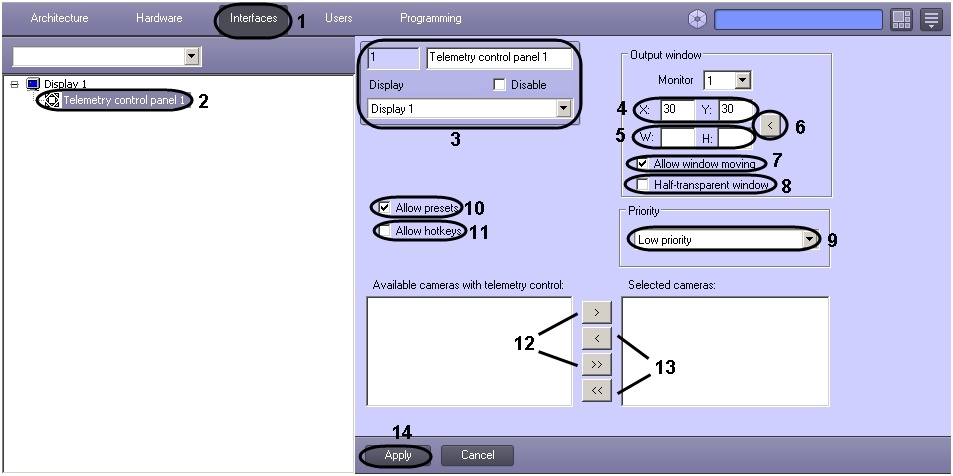 - Create the Telemetry control panel object under the Display object or select the relevant object in the Interfaces tab of the System settings dialog box (2).