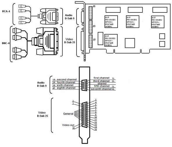 WS-7 video capture card has two external pins - D-SUB-9 and D-SUB-25. D-SUB-25/BNC interface cable is used for simultaneous connection of 4 cameras to the external D-SUB-25 pin of WS-7 video capture card. D-SUB-9/RCA interface cable is used for simultaneous connection of 4 audio channels to the external D-SUB-9 pin of WS-7 video capture card.