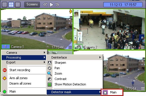 Access to main detector mask editing is performed via the video surveillance window functions menu. To enter mask editing mode, select the Detector mask item from the Processing submenu.
