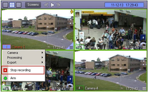 The operator can stop video recording forcibly in any mode and at any time with the Stop recording item from the functions menu of the video surveillance window.