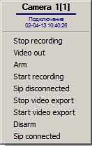Device functions can be accessed via a functional menu called up by a right mouse click on the symbol of the device shown on the Map. For instance, the functional menu of the Camera object is shown in the figure.
