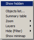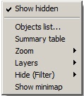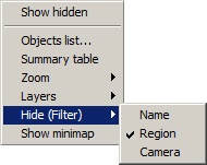 - With the filter on the map layer. This filter applies only to the current layer and hides all objects of the specified type or the names of objects. Hiding and displaying objects is performed using the Hide (Filter) command in the Map functional menu called with a right mouse click on any place on the Map, which is free from object symbols.