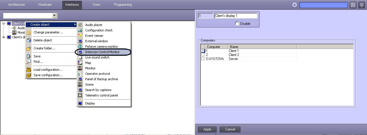 Click the right mouse button on the selected Display object and choose the Create objects - > Intercom Control Monitor item from context menu.