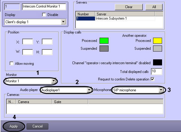 - From the Microphone drop-down list select the Microphone object  corresponding to the Client microphone which will be in use during the communication sessions with SIP-device (3).