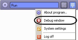 8. Select the Debug window item on the Main control panel in order to display the Debug window on the screen. The selected Debug window item is marked with a flag.