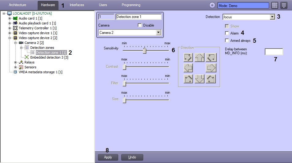 When the Armed always checkbox is set, the line with with the name of the detection tool is not displayed in the feature menu of the video surveillance window.- Set the value of the Sensitivity parameter by moving the the slider of the same name (6). This setting corresponds to the minimum drop in image sharpness (that is the difference between the average number of contours and the number of contours in the current frame), with which the detection tool is to trigger.