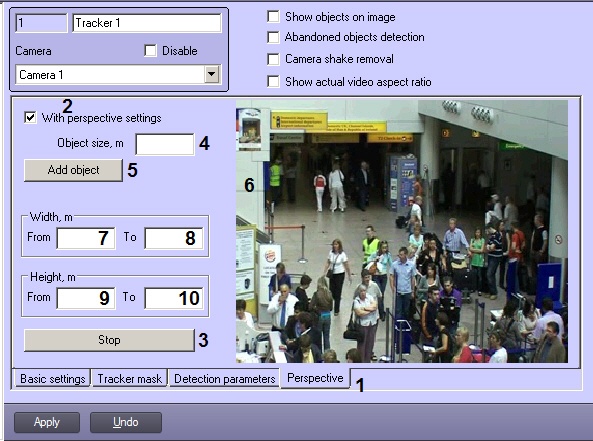 Perspective in the Tracker object is configured in order to set maximum and minimum object size (in meters) for these sizes to be considered correctly regardless of the fact that small objects can look bigger than big objects in the background. Perspective calibration allow better performance of the Tracker object.