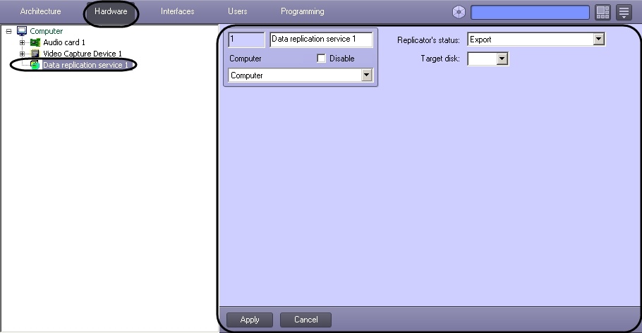 Data replication service is configured on the settings panel of the Data replication service object. This object is created under the Computer object in the Hardware tab of the System settings dialog box.