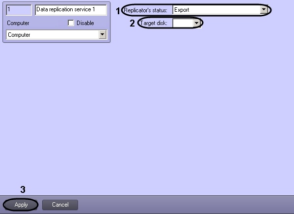 - In the Replicator’s status dropdown list select the Export value if the Server is an archive Source or the Target value if the Server is a target (1).