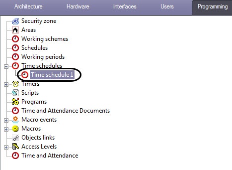 - Create the Time schedule object on the basis of the Time schedules object in the objects tree (2).