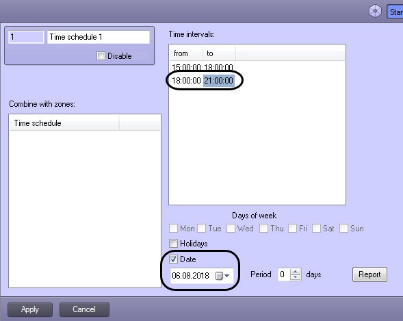 If the moment of time interval beginning is set later than the moment of ending, then time schedule will cover the present day (from the time interval beginning) and part of the following day (to the time interval ending) on conditions that the Time schedule is set for the present and following day. If the Time schedule is set only for the present day, then the Time schedule will end at 0:00:00.