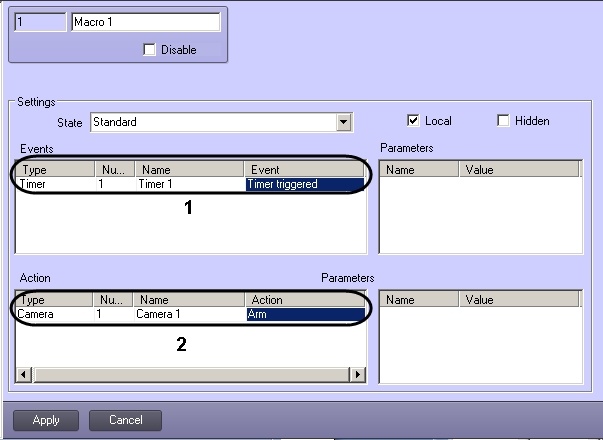 Example 1. Consider a macro that activate an arming mode in selected camera when the timer triggers.