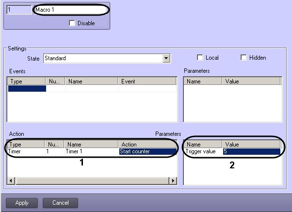 | Start counter of Timer 1 (1) | Trigger value is 5 seconds (2) |