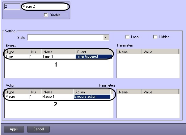 2 | The timer 1 triggered (1) | Macro 1 execution (2) |