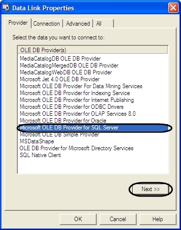 - Select the Microsoft OLE DB Provider for SQL Server line in the Provider tab and click the Next button or move to the Connection tab.