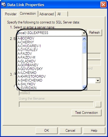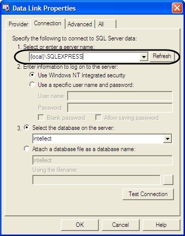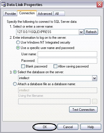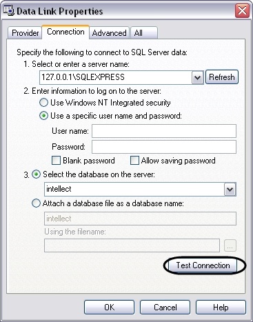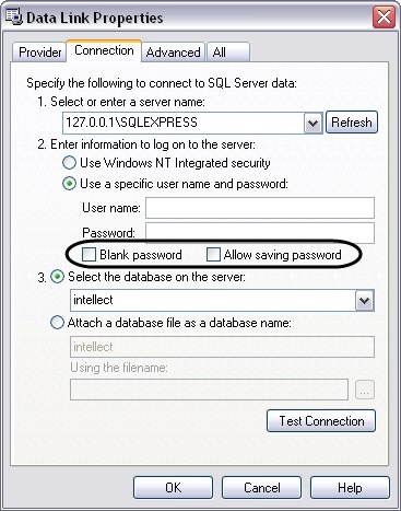 By default while installing the Intellect complex, the user(login) «sa» and Administrator password SQL Server (is registered while installing SQL Server, see Installing INTELLECT™ software) are set for authorization on SQL server- When the Use Specific User name and Password radio-button is selected, the Blank Password and Allow Saving Password checkboxes become enabled.