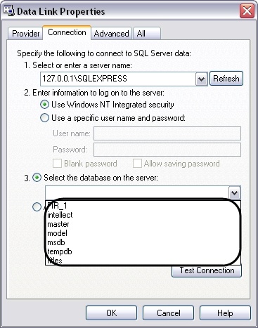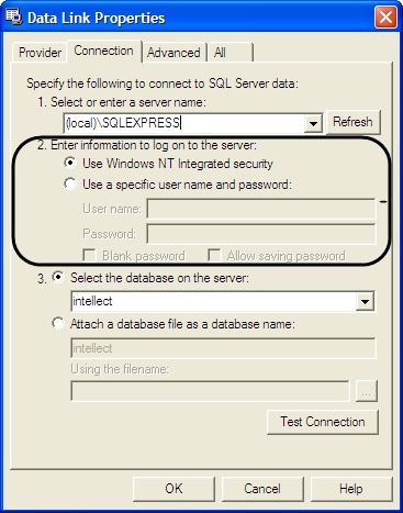 Used mostly to connect to the local SQL server.- The Use Specific User name and Password radio-button. The specific user name and password are used to connect to the SQL server.