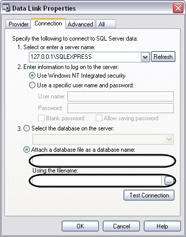 If necessary, the name of the database to connect to can be entered in the Attach Database File as Database Name field, or in the Using the Filename field.Test the connection to the SQL server by clicking the Test Connection button.