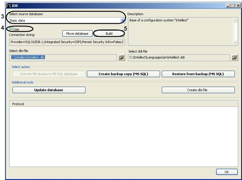 - Start the idb.exe utility in the root of the INTELLECT™ software installation directory (for example, C:\Program Files (x86)\Intellect). The idb.exe utility dialog box is displayed.