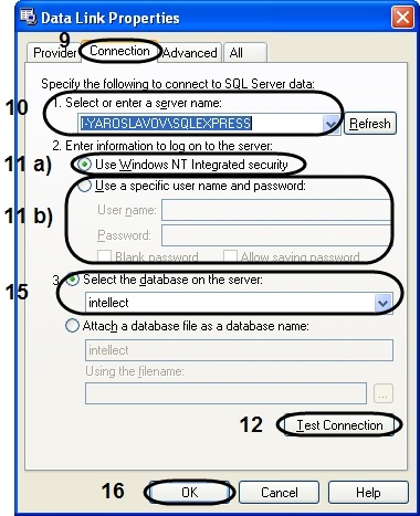 In the 1.Select or enter a server name line select in the list or type-in the name of MS SQL server which is used to store the database to be connected