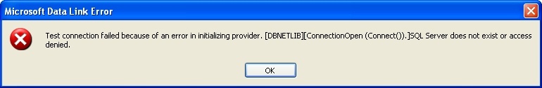 Click the OK to close the box. - If the MS SQL server name and/or authentication parameters of the MS SQL server connection were erroneous, the error message will appear.
