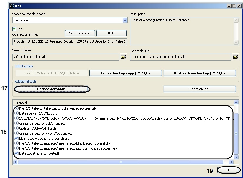 When the conversion process is successfully completed, the Data Updating is completed! message appears in the Protocol table of the idb.exe utility. - Click the OK in the bottom right corner of the idb.exe utility.