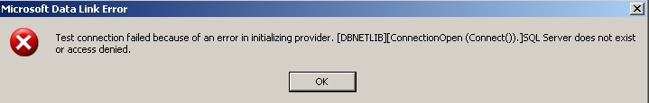 Click OK to close the window. - If the MS SQL server name and/or authentication parameters of MS SQL server connection were entered inaccurately, the error message will appear.