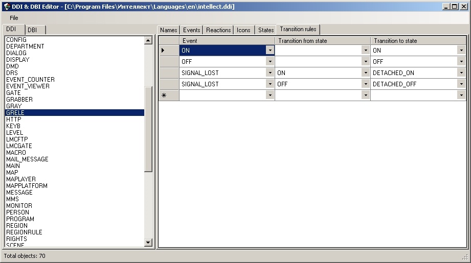 Transition rules connect the events generated by objects, and the states of these objects. Each rule consists of the starting state of the object, an event, and an ending state that the object will take after the event.