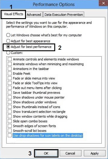 - Go to the Visual effects tab in the appeared Performance Options window (1).