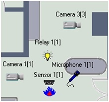 The Map window is used to monitor and control various devices throughout the surveillance system (cameras, microphones, sensors, relays), and to run macros.