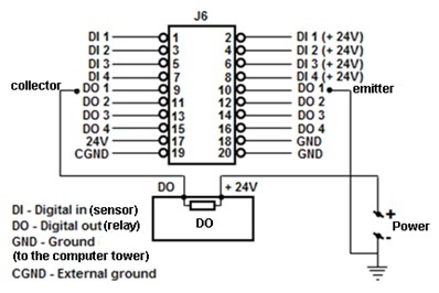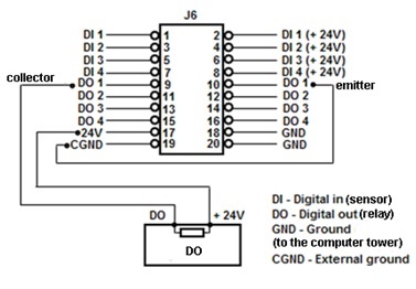 The 4/4 and 16/4 Sensor-Relay cards have power (24V) and grounding terminals. The 4/4 and 16/4 Sensor-Relay cards and are installed in the J9 connector on FS-5, FS-6, FS-16 and FS-8 video capture cards (see Appendix 5. Video capture cards pins).