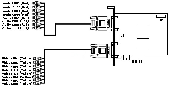 VRC6008 video capture card has two external D-SUB-15 pins. D-SUB-15/BNC interface cable is used for simultaneous connection of up to 8 cameras and 8 audio channels to the external D-SUB-15 pin of VRC6008 video capture card. DI/DO card is connected to the J2 pin. Pin J1 corresponds to analog video out.