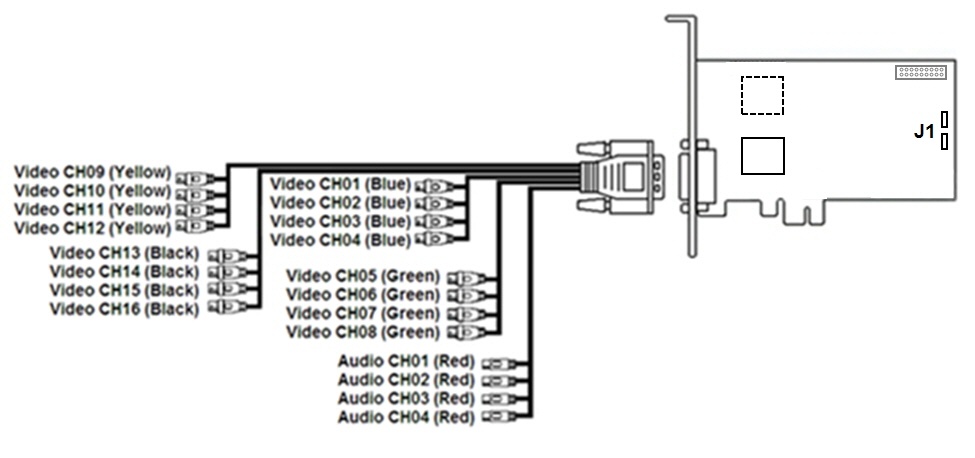 SC330Q16 video capture card has one external DVI-I (24+5) pin. Video and audio connection is performed with the help of DVI-I/BNC and DVI-I/RCA stubs correspondingly. Simultaneous connection of up to 16 cameras and up to 4 sound sources to one external pin of SC330Q16 video capture card is possible. The Watchdog cable is connected to the J1 pin.