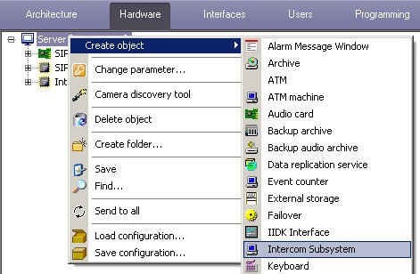 - Click the right mouse button on the selected Computer object and choose the Create object - > Intercom Subsytem item from the context menu.