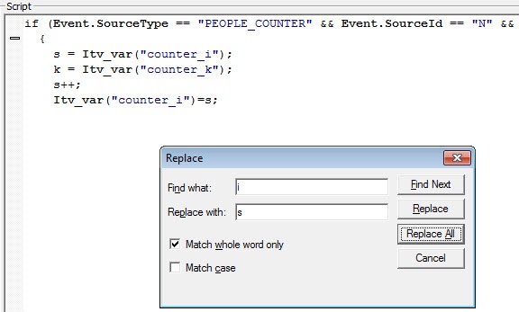 The Editor-Debugger utility allows replacing text in script using a dialog box.
