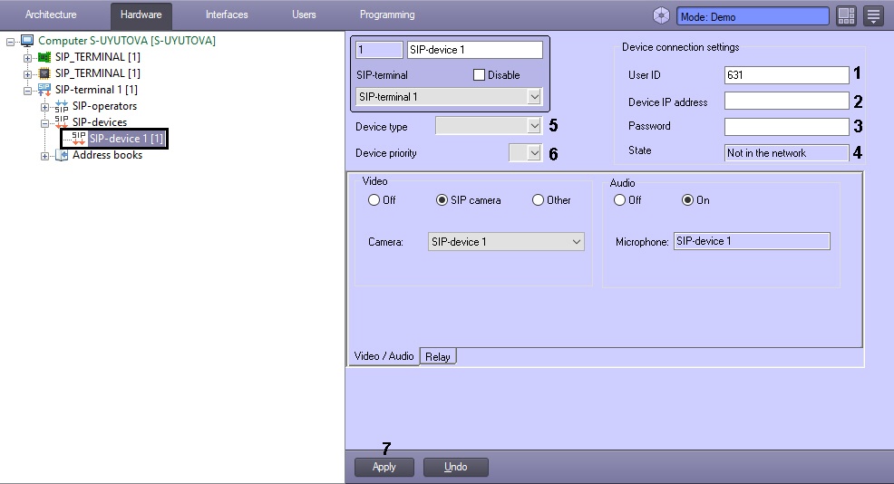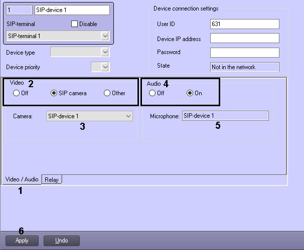 - Go to the Video / Audio tab (1) on the settings panel of the SIP-device object.