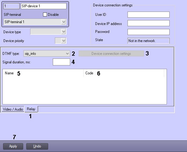 - Go to the Relay tab (1) on the settings panel of the SIP-device object.