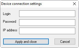 In this window, specify the Login, Password and IP address of the SIP device. If the port is different from the actual one (for example, it's 8180, not 80), then specify the port in the IP address field also. If the IP address field is left blank, then the IP address will be taken from the session, and the port will be presumed to be 80.