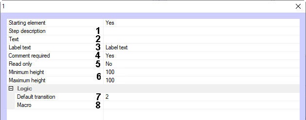 - If necessary, in the Step description field (1), enter the text that will be displayed in the column to the left opposite the element.