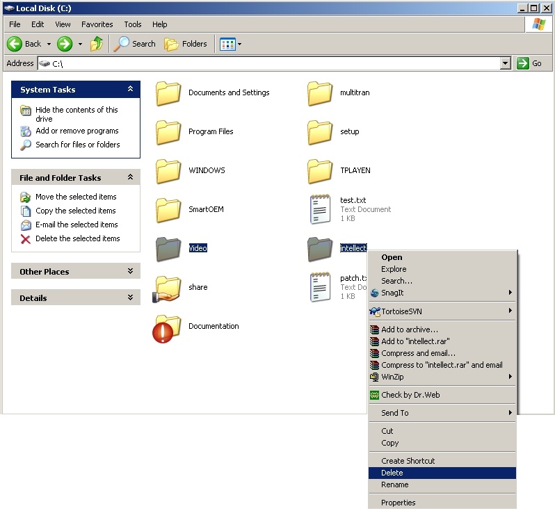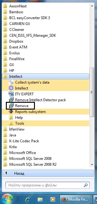 - En el menú del símbolo del sistema, seleccione lo siguiente: Iniciar -> Programas ->Intellect y a continuación Desinstalar en la lista desplegable, tal y como se muestra en la imagen.