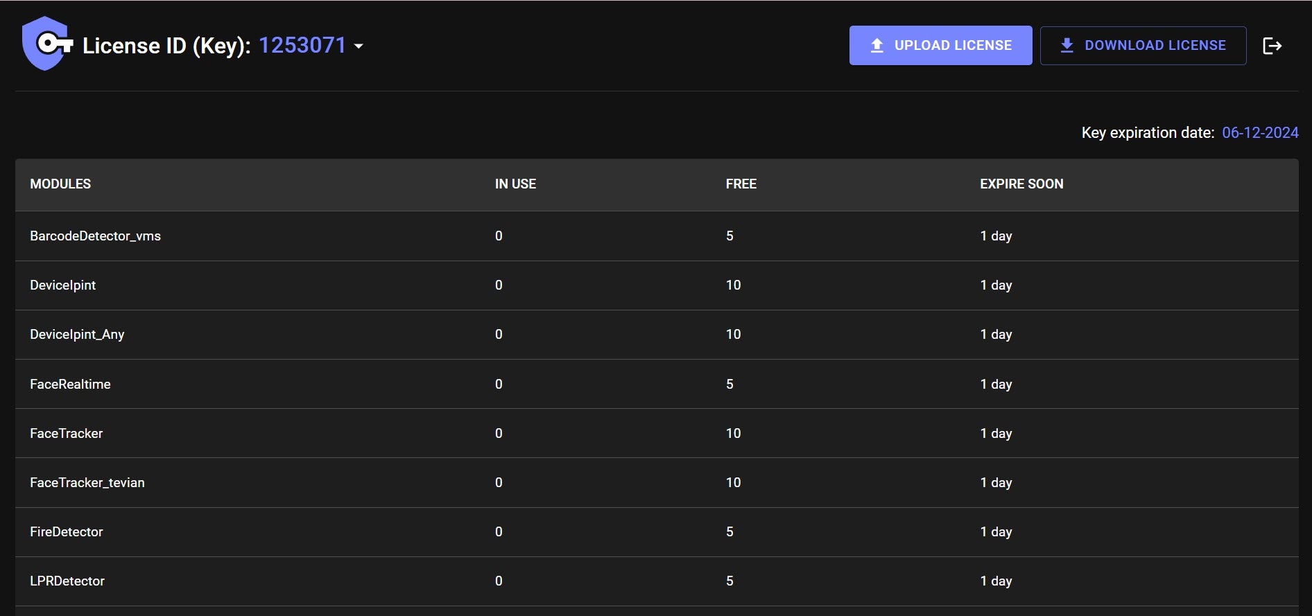 In the upper-left corner, you can find the unique License ID (Key). Clicking the button next to the current license ID opens a list of other licenses if multiple licenses have been added to License Server. The key expiration date is displayed in the upper-right corner.