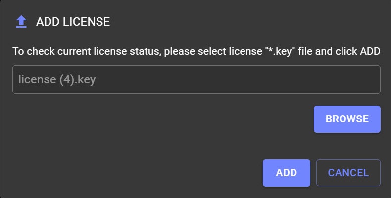 A license key is generated using the identifiers of the current machine and is intended for use with the Axxon One License Server. To upload a license: