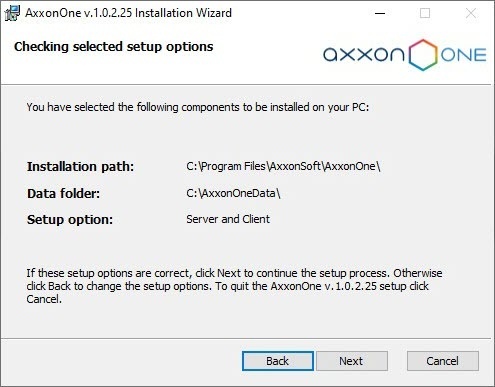 - Verify your installation settings and click the Next button to begin installation of Axxon One.