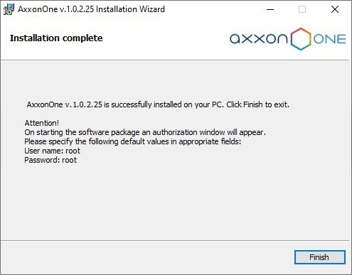 After installation, a new dialog window opens informing you that the installation of Axxon One is complete. - Click the Finish button to confirm completion of the installation.