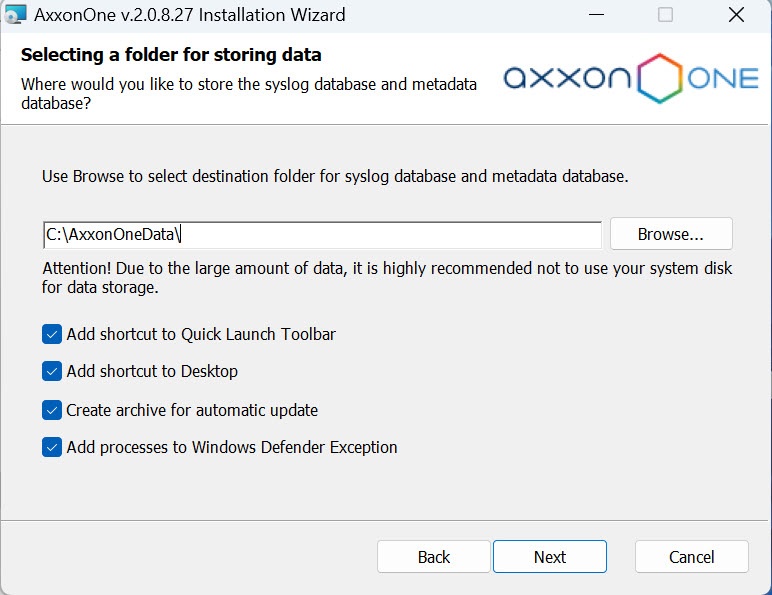 - The default path is <Drive letter with the largest amount of free memory>:\AxxonOneData\ (in the Data and vmda_db subfolders, respectively). In future, you can place the metadata database in the network storage (see Configuring storage of the system log and metadata). You can change the path by reinstalling Axxon One (without losing the configuration and video archive).