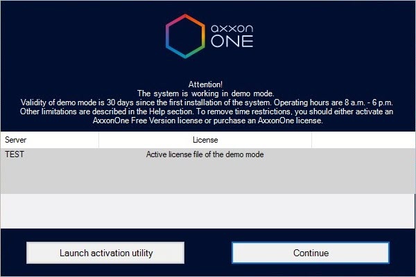 Activefrom 8 a.m. to 6 p.m.You can work with the Axxon One client with limited functionality according to Axxon One Demo license (see Types of licenses)