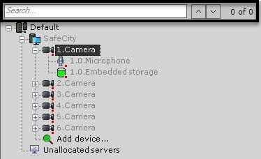 Axxon One allows you to search for objects in the objects tree using only part of their name or the IP address. An object search can be performed on all tabs under Devices.