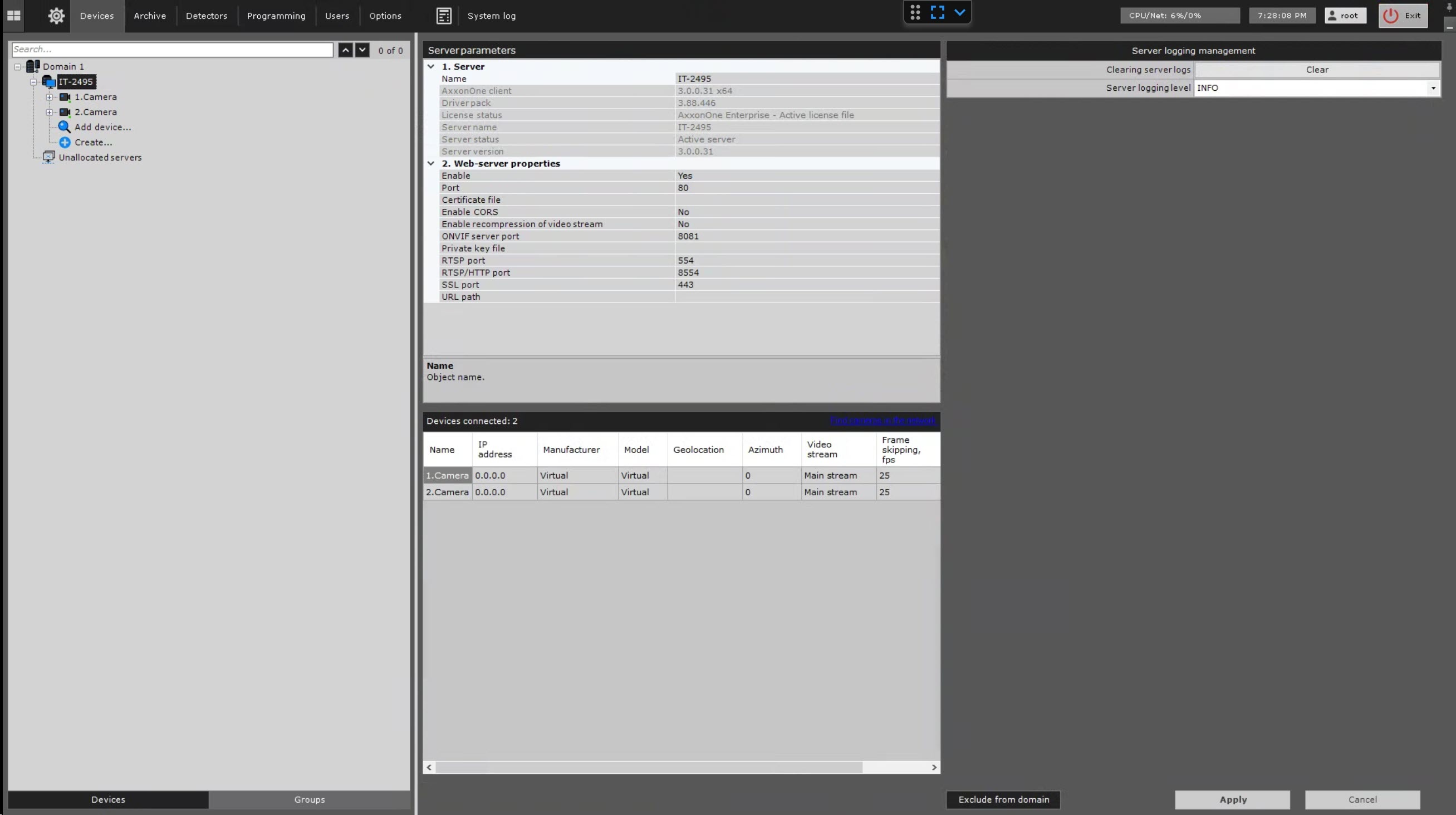 7. The Exclude from domain button excludes a server from the domain (see Removing a Server from an Axxon-domain).