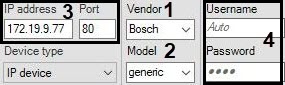 - In the form for manually adding an IP device, select the device manufacturer from the list (1).