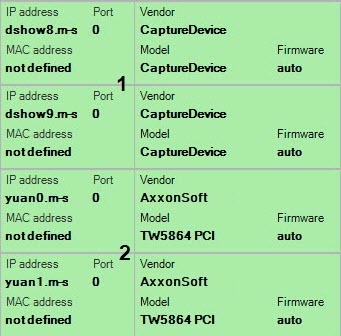 In Axxon One, each WS-216 video capture card corresponds to two devices: manufacturer AxxonSoft, model TW5864 PCI (driver Yuan, 2) and manufacturer CaptureDevice, model CaptureDevice (driver DShow, 1).